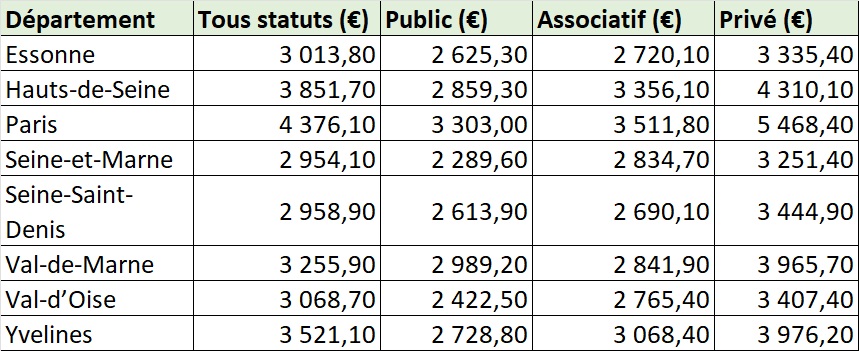 Les Hauts-de-Seine affichent les prix les plus élevés après Paris, avec des établissements privés dépassant 4 300 €.
